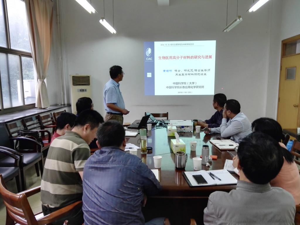 10月25日,应学院邀请,中国科学院长春应用化学研究所章培标研究员来院交流,并作“生物医用高分子材料研究进展”学术报告,生物学学科、环境科学与工程学科相关老师参加了报告会,报告中,章培标研究员就目前开展的生物医用高分子材料研究进展进行了详细介绍,会后,双方就研究具体层面开展了深入讨论。
