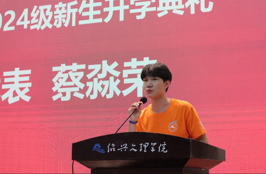 本科生新生代表蔡淼荣发言。他表示四年之后,想成为一名硕士研究生,到更高的平台,去看看那更广阔的天地。