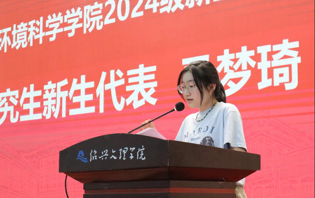 研究生新生代表马梦琦发言。她认为读研之旅,既是我们追求知识,逐梦青春的过程,也是我们探索自我,勇攀高峰的过程。